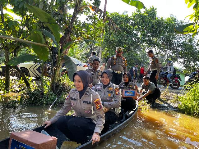 Selasa, 2 Januari 2023 siang, Kasat Lantas, bersama sejumlah Polisi Wanita (Polwan) Satlantas Polres Inhu, mengunakan sampan, mengarungi banjir di Desa Sungai Raya, Kecamatan Rengat. Merupakan salah satu wilayah yang berada di Daerah Aliran Sungai (DAS) Indragiri.