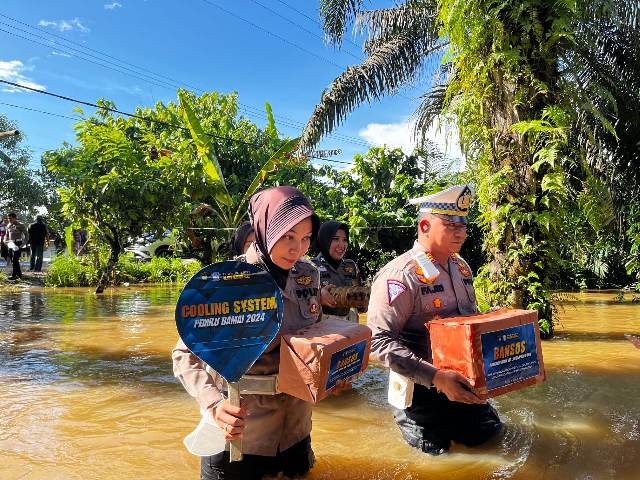 Arungi Banjir, Kasat Lantas Polres Inhu Bawa Polwan Cooling System dan Salurkan Bansos