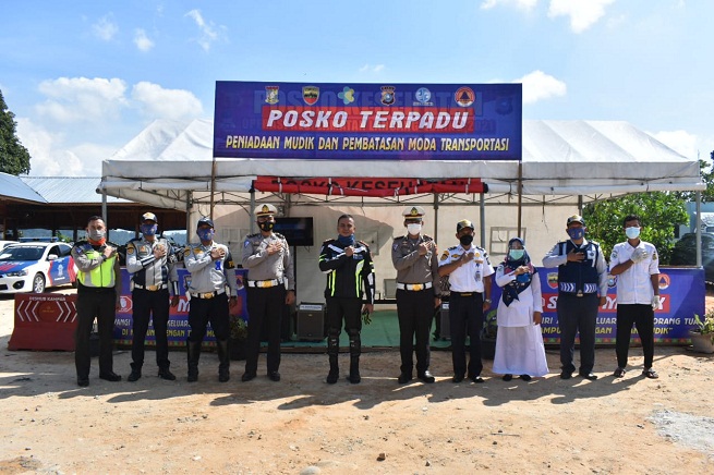 Direktur Lalulintas Polda Riau Kombes Pol Firman Darmansyah meninjau Posko Terpadu Peniadaan Mudik dan Pembatasan Moda Transportasi di Jalan Lintas Riau - Sumbar wilayah Desa Tanjung Alai Kecamatan XIII Koto Kampar, Kamis (29/04/2021) sore.