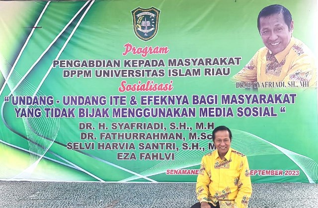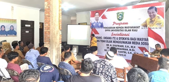 SINAMA NENEK, VokalOnline.Com - Dosen Fakultas Hukum Universitas Islam Riau Dr H Syafriadi SH MH melaksanakan pengabdian kepada masyarakat dalam bentuk penyuluhan hukum di Desa Sinama Nenek Kecamatan Tapung Hulu Kabupaten Kampar Provinsi Riau. Kegiatan bertajuk ''Undang Undang ITE dan Efeknya Bagi Masyarakat yang Tidak Bijak Menggunakan Media Sosial'' dilaksanakan di ruang pelayanan Kantor Desa pada Senin [18/09 2023] pukul 11.00 - 12.30 wib.