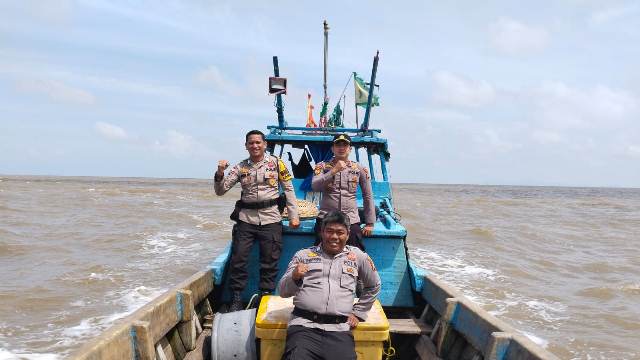 Dengan menggunakan kapal Pompong, para personel Polsek Rangsang ini terlihat dihempaskan gelombang yang sedang dilanda oleh angin Utara.