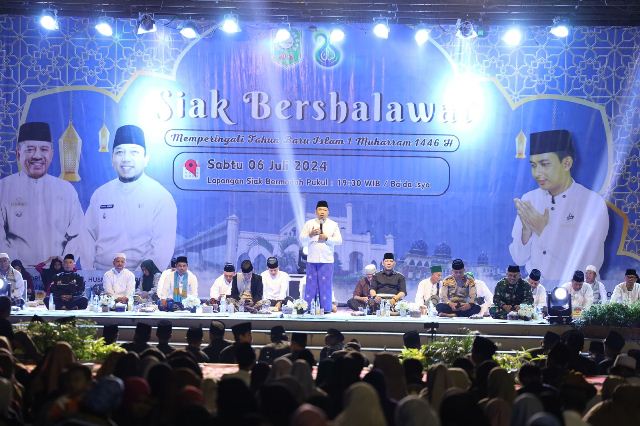 "Alhamdulillah, saya mewakili Bapak Bupati Siak Alfedri dan juga atas nama Pemerintah Daerah Kabupaten Siak sampaikan ucapan terimakasih kepada masyarakat Kabupaten Siak dan pemangku kebijakan lintas sektor dan tokoh masyarakat, serta seluruh Aparatur Sipil Negara (ASN) dalam mensukseskan Doa dan Gebyar Sholawat dalam rangka menyambut Tahun Baru Islam 1446 Hijriyah ini", Harapan Husni Merza.